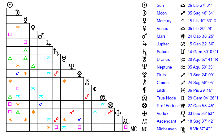 | Mercury | 15 Libra 30 | 17 Scorpio 51 | 6 Scorpio 56 |