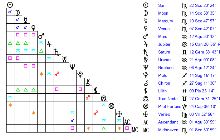 | Sun | 21 Scorpio 57 | 22 Scorpio 8 | 16 Sagittarius 14 |