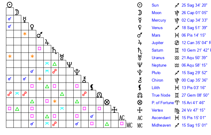 | Pluto | 15 Sagittarius 30 | 2 Aquarius 17 | 16 Sagittarius 22 |