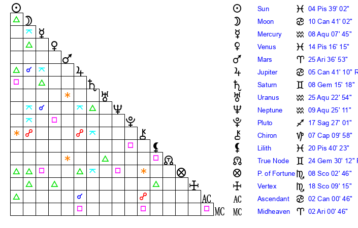 | Mercury | 7 Aquarius 56 | 16 Pisces 14 | 9 Pisces 58 |