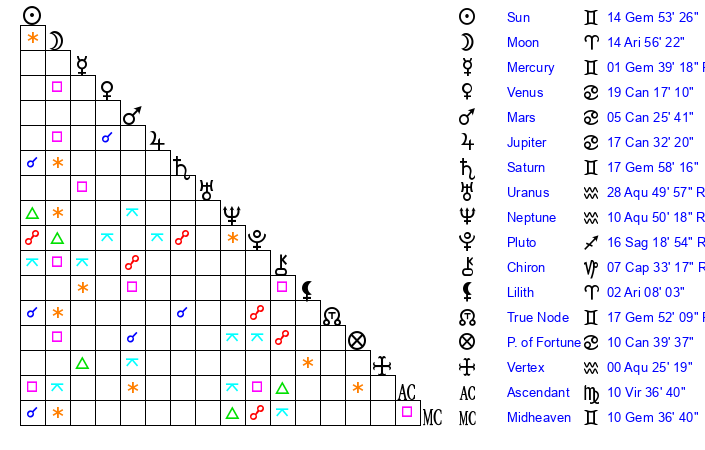| Saturn | 17 Gemini 49 | 0 Aries 39 | 20 Gemini 47 |