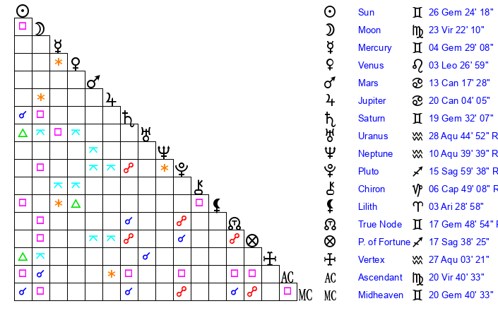| Moon | 16 Virgo 1 | 6 Pisces 50 | 15 Cancer 49 |