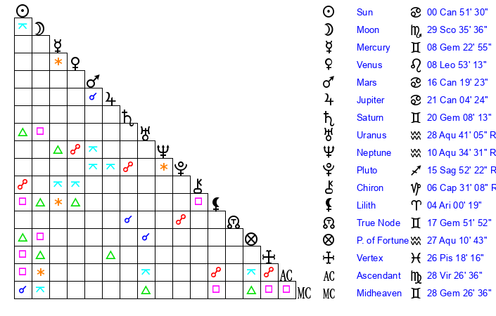 | Moon | 26 Scorpio 55 | 17 Taurus 25 | 26 Virgo 55 |
