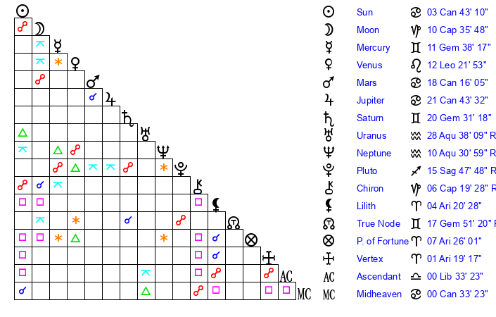 | Saturn | 20 Gemini 24 | 1 Aries 33 | 23 Gemini 14 |