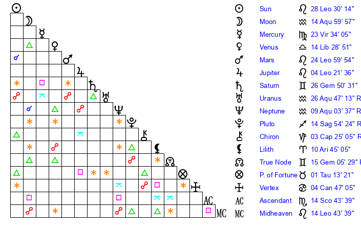 | Moon | 8 Aquarius 54 | 3 Leo 55 | 14 Sagittarius 14 |