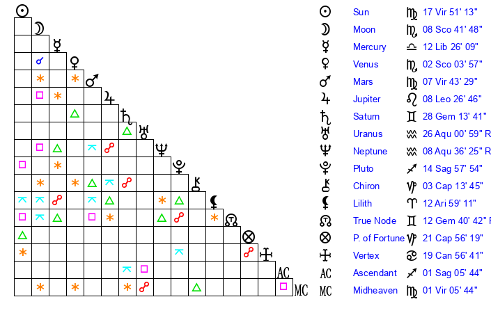 | Mercury | 12 Libra 14 | 14 Virgo 53 | 29 Virgo 24 |