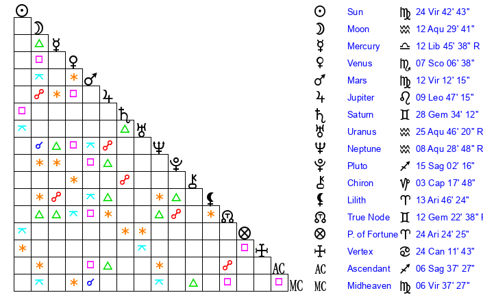 | Mercury | 12 Libra 55 | 27 Virgo 56 | 29 Virgo 21 |