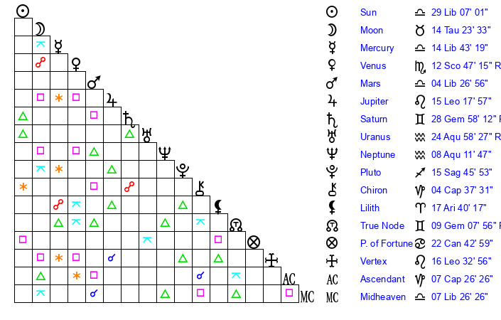 | Sun | 28 Libra 41 | 29 Libra 6 | 21 Scorpio 42 |