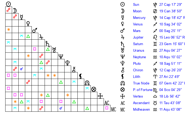 | Pluto | 18 Sagittarius 51 | 1 Aquarius 34 | 19 Sagittarius 27 |
