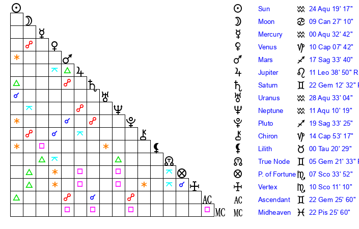 | Sun | 24 Aquarius 8 | 24 Aquarius 48 | 16 Pisces 16 |