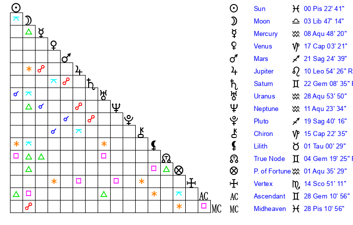 | Neptune | 11 Aquarius 23 | 28 Pisces 32 | 12 Aquarius 8 |