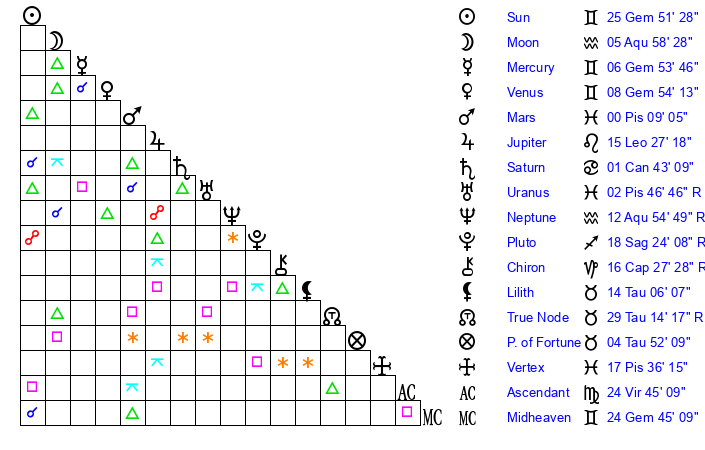 | Neptune | 12 Aquarius 55 | 2 Aries 5 | 12 Aquarius 28 |