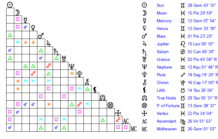 | Mars | 1 Pisces 19 | 1 Virgo 38 | 8 Pisces 16 |