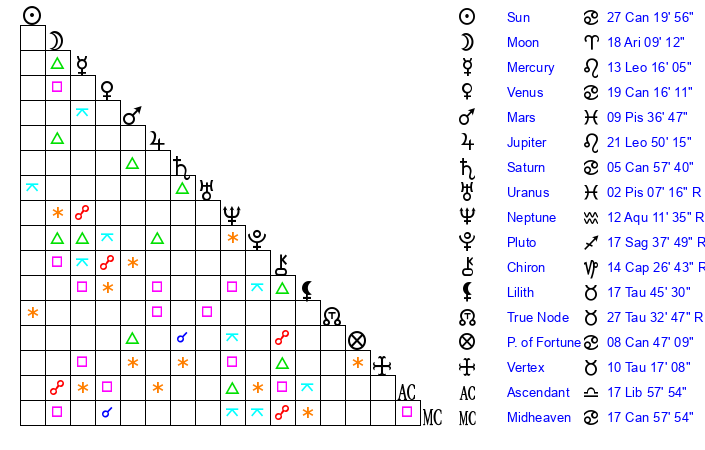 | Moon | 16 Aries 0 | 27 Taurus 37 | 6 Aquarius 19 |