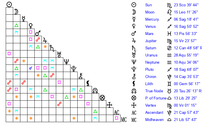 | Sun | 23 Scorpio 29 | 24 Scorpio 9 | 15 Sagittarius 44 |
