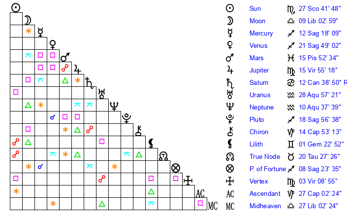 | Moon | 6 Libra 24 | 28 Scorpio 4 | 27 Cancer 22 |