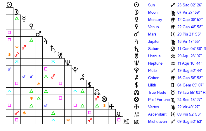 | Pluto | 19 Sagittarius 53 | 2 Aquarius 14 | 20 Sagittarius 42 |