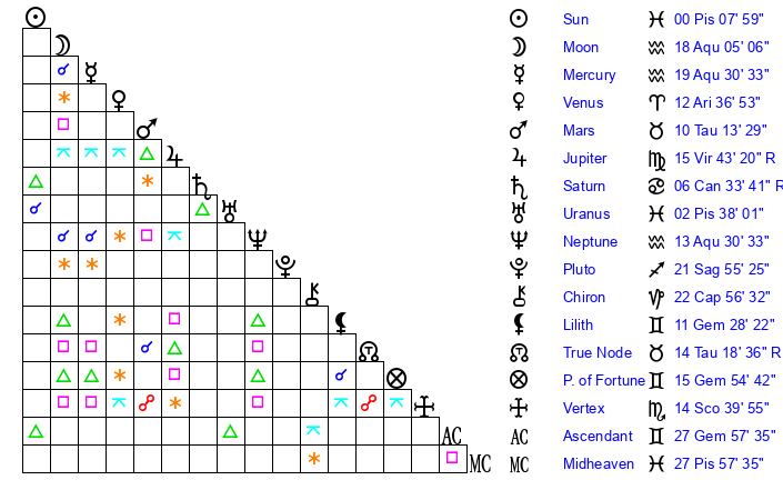 | Mercury | 19 Aquarius 12 | 8 Pisces 49 | 27 Pisces 47 |
