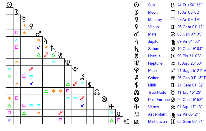 | Mercury | 28 Aries 58 | 8 Taurus 23 | 29 Taurus 31 |