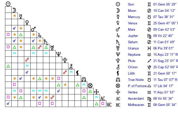 | Venus | 25 Gemini 46 | 15 Aries 57 | 15 Gemini 29 |