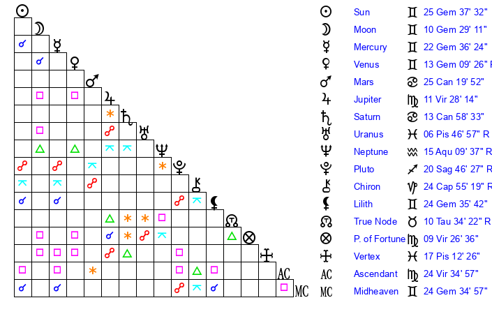 | Sun | 25 Gemini 27 | 25 Gemini 23 | 15 Cancer 29 |