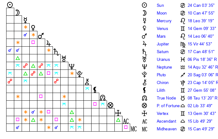 | Moon | 10 Cancer 49 | 1 Aries 4 | 25 Aries 25 |