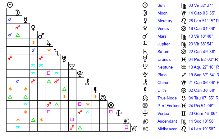 | Mars | 10 Virgo 4 | 12 Libra 13 | 23 Virgo 29 |