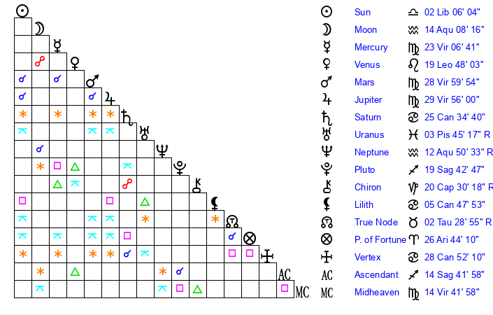 | Mercury | 22 Virgo 5 | 10 Libra 10 | 28 Libra 53 |