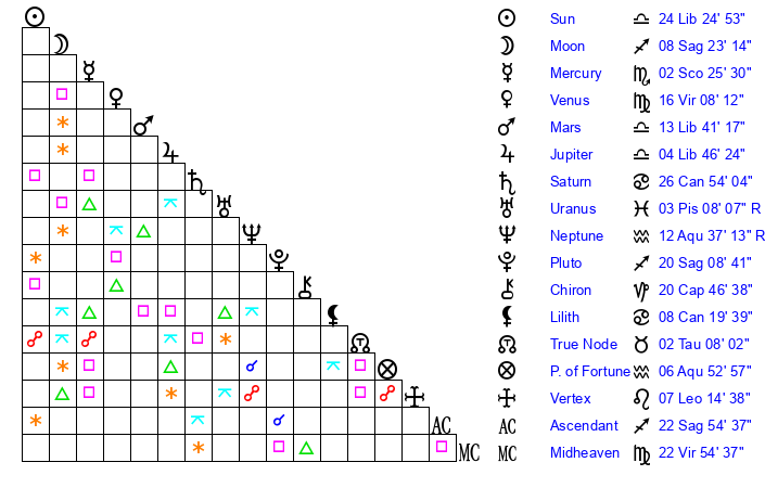 | Sun | 24 Libra 14 | 24 Libra 8 | 15 Scorpio 11 |