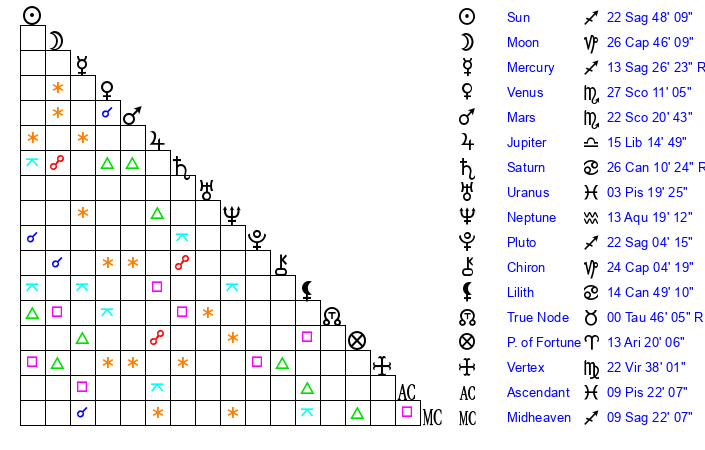| Mars | 22 Scorpio 14 | 29 Sagittarius 13 | 6 Sagittarius 37 |