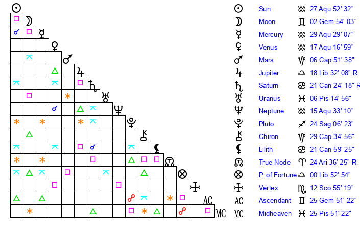 | Moon | 0 Gemini 36 | 9 Libra 15 | 19 Aquarius 2 |