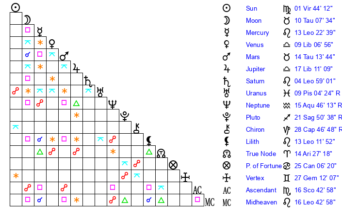 | Moon | 2 Taurus 34 | 13 Virgo 21 | 13 Capricorn 54 |