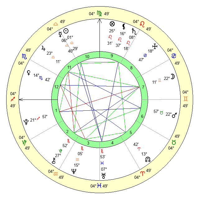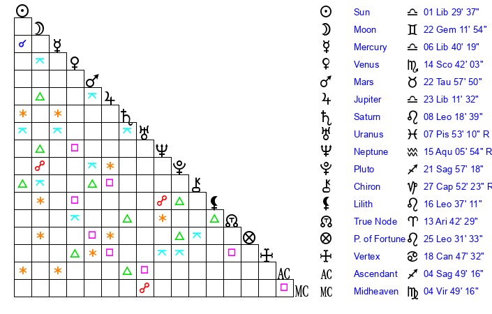 | Venus | 14 Scorpio 29 | 5 Virgo 48 | 6 Sagittarius 52 |
