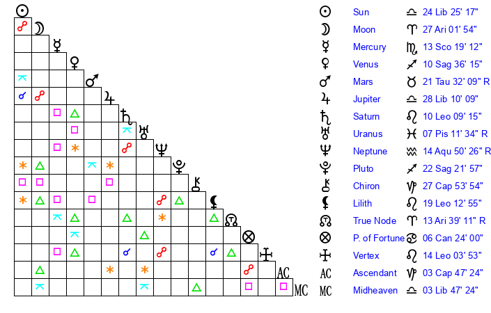 | Neptune | 14 Aquarius 51 | 0 Aries 6 | 14 Aquarius 51 |