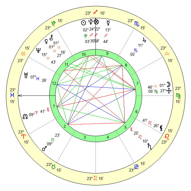 | Moon | 25 Virgo 30 | 7 Aquarius 39 | 27 Gemini 40 |