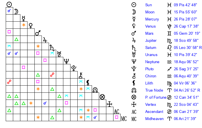 | Sun | 9 Pisces 31 | 9 Pisces 55 | 28 Pisces 31 |