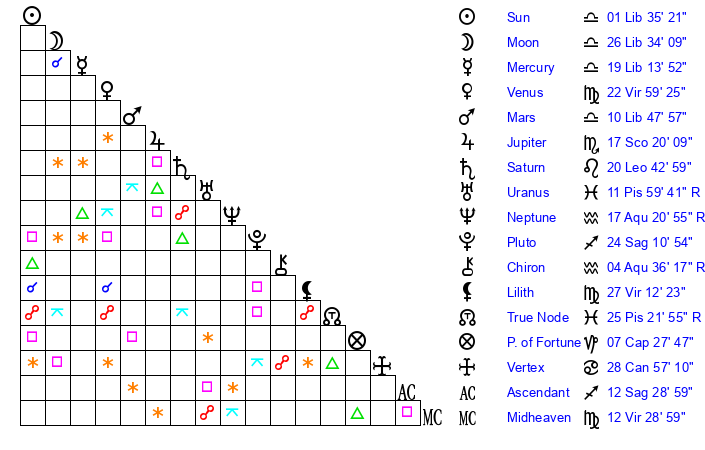 | Neptune | 17 Aquarius 22 | 0 Aries 43 | 17 Aquarius 6 |