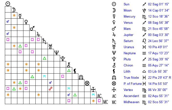 | Pluto | 25 Sagittarius 39 | 1 Aquarius 45 | 26 Sagittarius 20 |