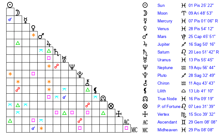 | Neptune | 19 Aquarius 57 | 28 Pisces 35 | 20 Aquarius 36 |