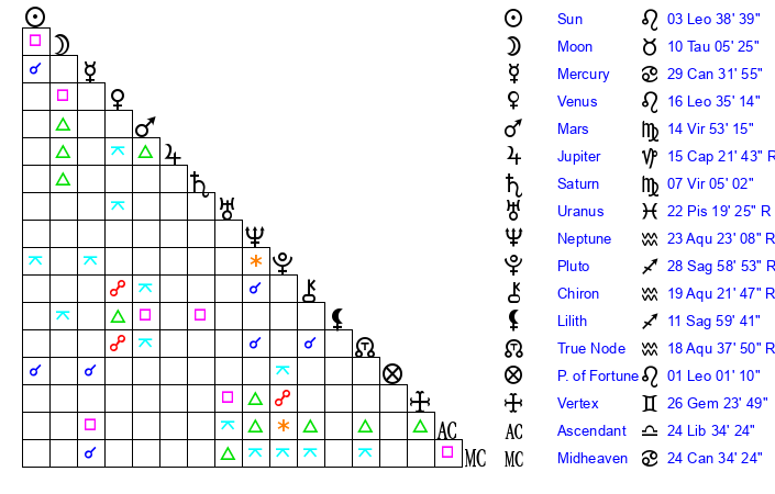 | Moon | 9 Taurus 58 | 22 Leo 0 | 27 Sagittarius 29 |