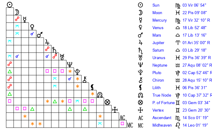| Moon | 19 Pisces 57 | 8 Libra 23 | 13 Libra 27 |