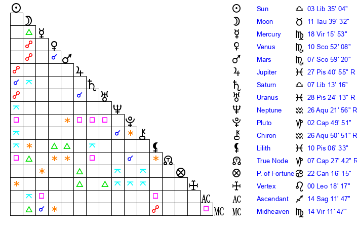 | Saturn | 7 Libra 18 | 28 Pisces 0 | 9 Libra 9 |
