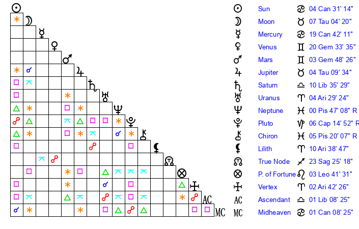 | Moon | 4 Taurus 44 | 16 Cancer 7 | 14 Scorpio 6 |