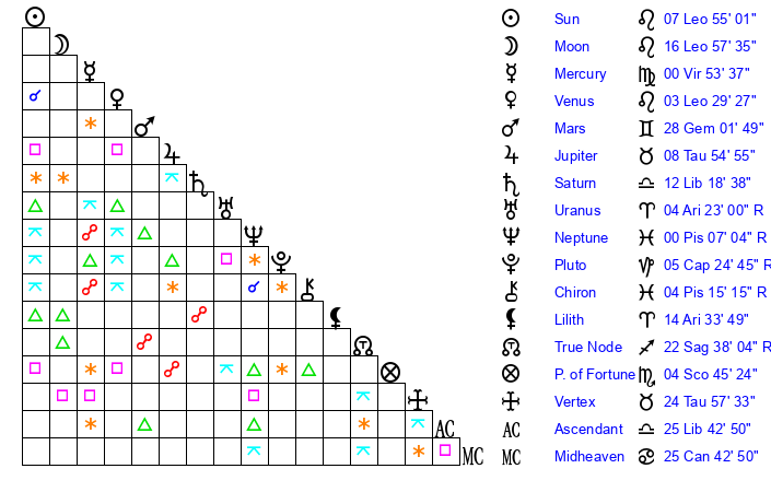 | Mercury | 0 Virgo 50 | 9 Leo 32 | 26 Leo 7 |