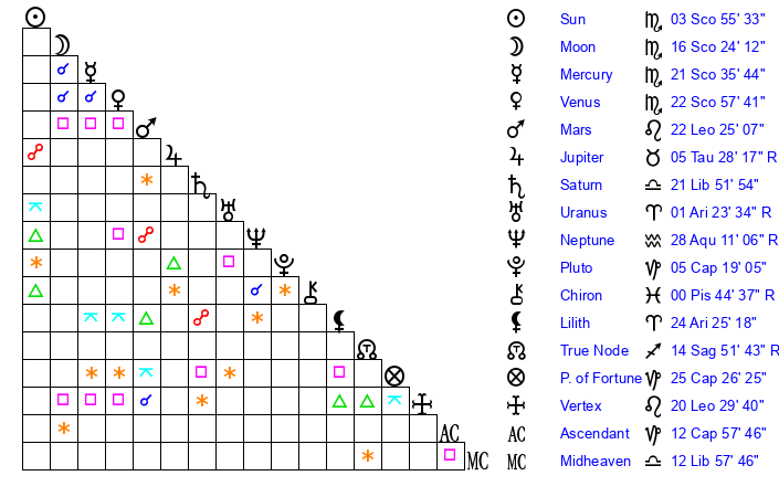 | Mercury | 20 Scorpio 58 | 27 Scorpio 40 | 9 Sagittarius 42 |