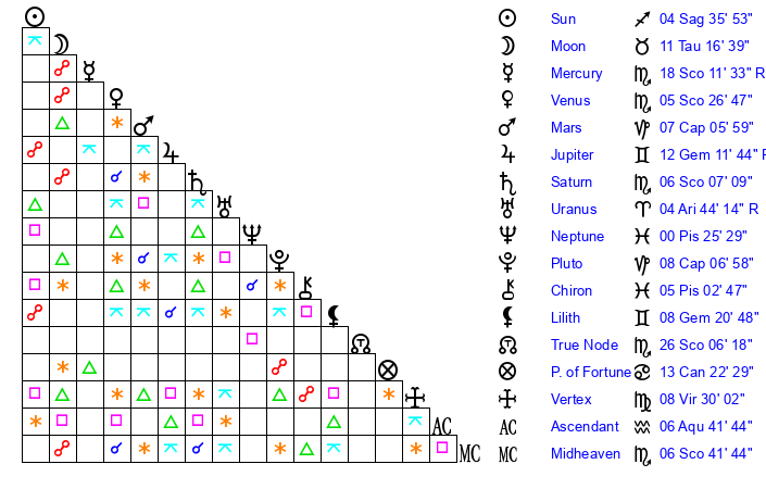 | Saturn | 6 Scorpio 17 | 25 Pisces 4 | 7 Scorpio 40 |