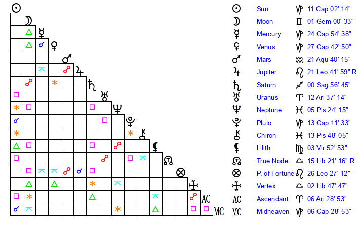Moon | 24 Taurus 10 | 27 Capricorn 32 | 27 Virgo 16 |