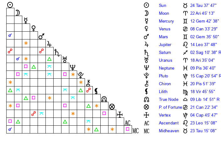 | Moon | 15 Aries 15 | 23 Sagittarius 10 | 28 Leo 53 |