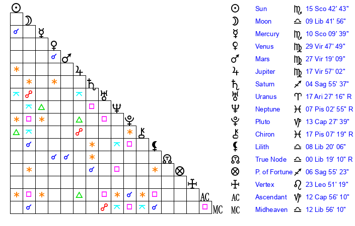 Venus | 29 Virgo 36 | 25 Sagittarius 49 | 9 Libra 28 |