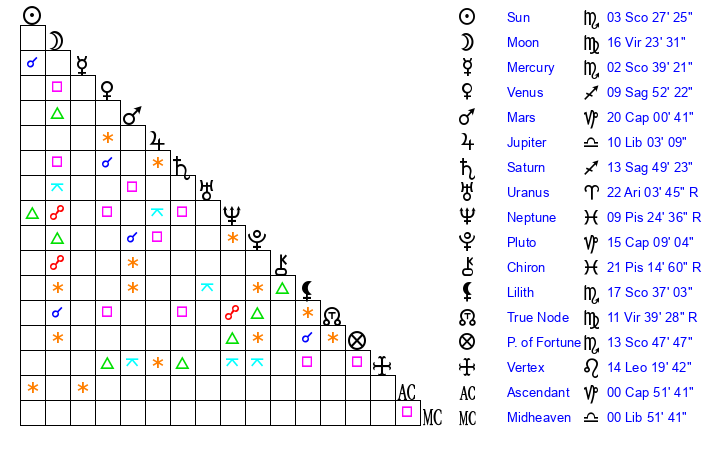 | Moon | 14 Virgo 2 | 24 Sagittarius 54 | 1 Capricorn 47 |